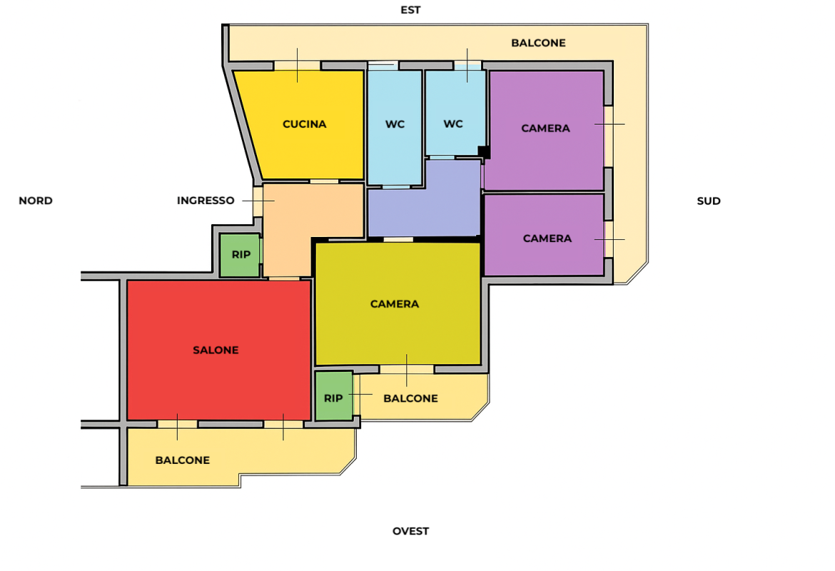 L’appartamento gode di una tripla esposizione Sud-Ovest-Est, che assicura ottima luminosità durante tutto l’arco della giornata e una buona ventilazione naturale degli ambienti.
